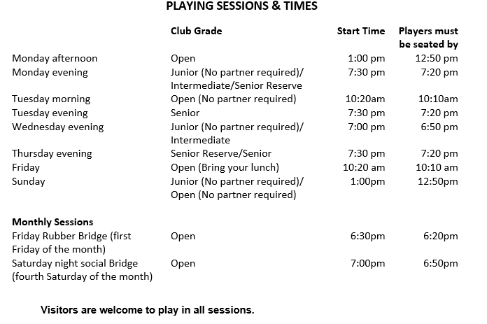 - The Club hosts Bridge sessions throughout the week, more information about the sessions available is displayed further down this page.