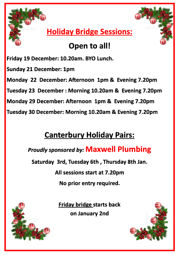 Canterbury Regional Committee: The Canterbury Regional Committee is seeking two more volunteers to be part of the Regional Bridge committee. Please contact Sarah Garland (Club member) if you are interested. Club Subscriptions: Invoices have been sent out to members via email. If you have not received an email, please let the office know. Reminder: the sub is $90 if paid before the 31st January, 2026 otherwise it will be $100. Canterbury Charity Pairs: Date: Saturday 13th December. Enter on-line. Canterbury Holidays Pairs: Proudly sponsored by Maxwell Plumbing; Dates: Saturday 3rd, Tuesday 6th and Thursday 8th January. Please Note: there is an error in the Match programme book under the Tuesday and Thursday sessions with the Saturday date to confirm it is the 3rd not the 1st Jan as stated). Christmas Bridge Sessions: Monday 22nd and 29th December: 1pm and 7.20pm Tuesday 23rd and 30th December: 10.20am and 7.20pm Sessions are open to all. Handbags: Please can members hang their handbags either on the back or completely under their chair. A member tripped over a handbag strap which caused an injury. 2026 Match Programme Books: These are now available to be picked up from the club. One copy per member. Ron Klinger Seminar: this Friday at 2.15pm. Please contact the office if you are wanting to attend. Cost $25 Friday Night Rubber Bridge: this Friday at 6.30 – 8.30pm, last one for the year. All welcome, no partner required.