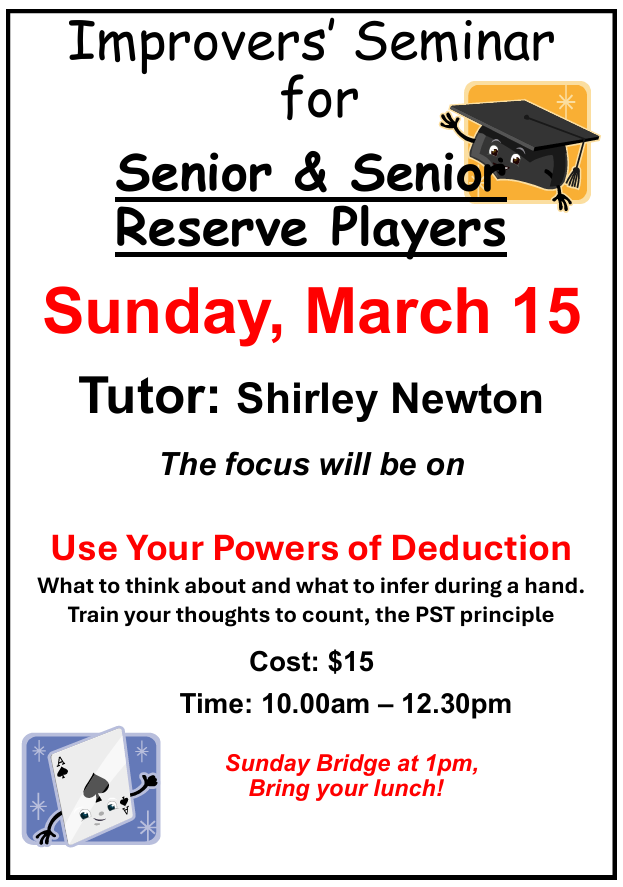 Tournament Results: Australia Summer Festival of Bridge: Fixed Income One Day Swiss: 1st – Jessie Pelenato / Leon Meier Open Swiss Pairs: 5th – Leon Meier / Geo Tislevoll Convenors: Looking for a convenor(s) for a Tuesday evening & Sunday. Please let the office know if you could be interested or want to know what is required. Beginner Bridge Lessons: Starts: Wednesday, January 28 for 13 weeks. Tutor: Shirley Newton Back to Bridge Refresher Course: Starts: Monday, February 2nd for six weeks. Tutor: Leon Meier Subscriptions: Due by the $31st January, after the 31st, they will be $100. Garden Working Bee: Saturday 31st January, 9.30 til 12.30pm. Tuesday Night session: Please ring Bernard Chidgey if you require a partner on 981-6526 or 027 244-3409.