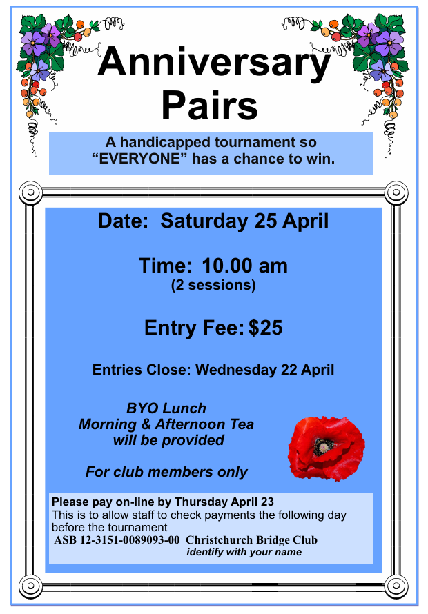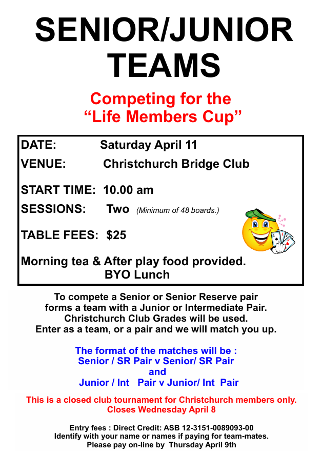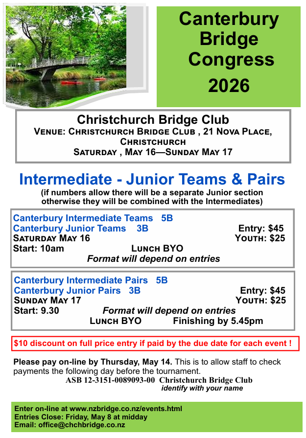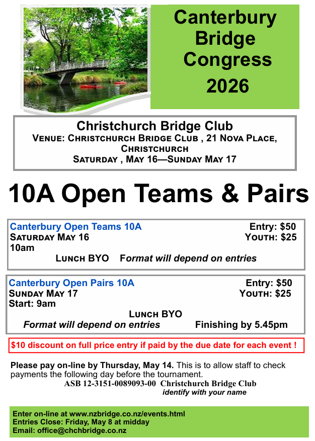 Easter Bridge: Bridge as usual over the Easter Break including the Monday night session are open to all players. The Friday Rubber Bridge session for the 3rd April is postponed due to Easter. NZ Youth On-line Bridge fundraiser: Friday 3 April at 10am See foyer noticeboard for further details or go to NZ Bridge tournament page. Senior Junior Teams: Date: Saturday 11 April In this tournament a Senior/Senior Reserve pair team up with an Intermediate/Junior pair. Seniors play seniors and juniors play juniors. Anniversary Pairs: Date: Saturday 25 April This is a handicapped tournament. Both of the above two tournaments are for Club members only. Enter on the entry form in the Club foyer. The flyers for these events are also displayed on the Home page of this website. Tournament Results: South Canterbury Congress: Open Teams 3rd – Timothy Schumacher / Leon Meier / Michael Ware / Lysandra Zheng Intermediate Teams 2nd – Emma Fitzgerlad / Finley Duncan / Marie Butterfield / Lynda Roache 3rd – Ian Beattie / Rex Green / Ian Doel / Colin Clemens Open Pairs 1st – Jane Lennon / David Taylor 3rd – Leon Meier / Lysandra Zheng Intermediate Pairs 1st – Leo Hammond / Kat Holmes 3rd – Ian Beattie / Rex Green Junior Pairs 1st – Hue Tran / Lia de Vocht NZB LESSONS ONLINE START IN 10 DAYS Improve your bridge from home! Expert players will share winning tips and techniques, followed by a live RealBridge session, where attendees can practice what they learn! APRIL: Competitive Bidding Tips for Intermediate players MAY: Playing the Hand for newer players Attend Sunday 4-6pm or Tuesday 7-9pm or both for just $8! Registering is easy: · Go to nzbridge.helloclub.com · Put money in your account · In Calendar, click on the lessons you want to attend · You will receive a RealBridge link before each lesson, and follow-up emails afterwards! Check the noticeboard for dates and topics To read: NZB ONLINE LESSONS APRIL and MAY. Great value as it's only $8 to attend Sunday, Tuesday or both April lessons on Competitive Bidding are suitable for Intermediate players May lessons on Card Play are suitable for newer learners It's very easy to register on nzbridgehelloclub - check the noticeboard for details Garden Working Bee: Sunday 12 April at 9.30am until midday.