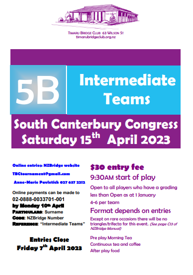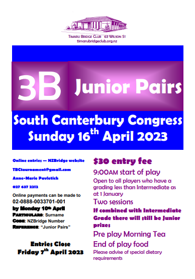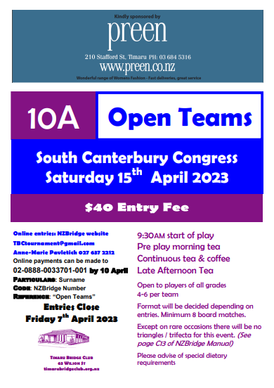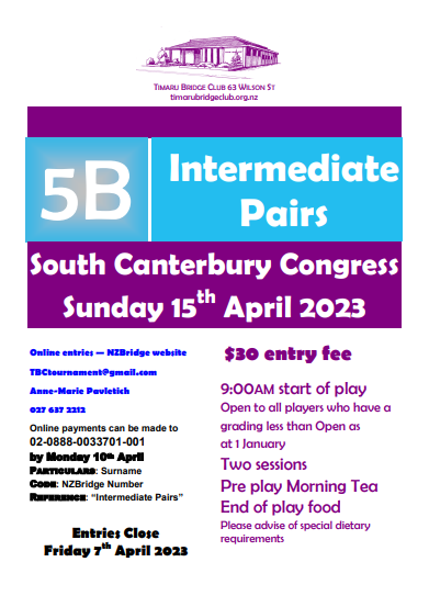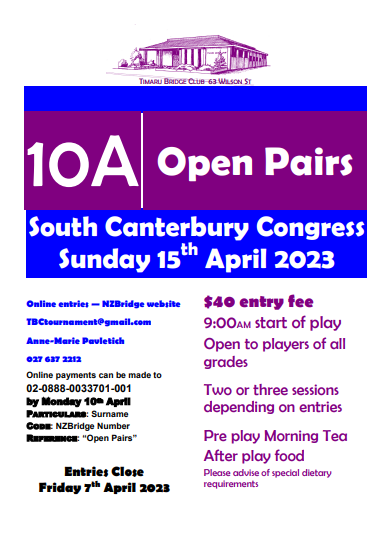 T ournament Results: Loveblock NZ Wide Pairs Our best placed pair 88th of 818 – Fiona Temple / John Kruiniger Canterbury All Grades Open: 1st – Kathryn Tennant / Jane Lennon Restricted Open: 1st – Judy Parkinson / Megan Eddy Intermediate: 1st – Kat Holmes / Jessie Pelenato Volunteers wanted for the upcoming Tournament Director Assessment Weekend Dates: Sat 25/Sun 26/Mon 27 October The volunteers will be used for scenarios – they are ‘players’ at a table, we provided them with a situation and the directors each come over, one at a time, to make a ruling. We need 4 people at any one time. Sign up list on the foyer noticeboard or email the office. Canterbury Interclub Teams: Date & Time: Sunday, November 2nd, 10 am Venue: Crockford’s Bridge Club If you wish to be put forward for consideration to represent the Club please either enter your names in the foyer or email the Club. Entries can be as teams or pairs. The tournament sub-committee will select teams to represent the Club in the 3 categories: Junior, Intermediate, & Open (Categories based on NZ Bridge rating points). The Club pays for the entry fees. Sign up in the foyer or email the office. Obituary: It is with great sadness to hear of the passing of Anna Bullen. She was a member here for over 50 years. A service to celebrate Anna’s life will be held on Tuesday 28th October at 2pm. Venue: St Barnabas Church, 8 Tui Street, Fendalton. Labour Weekend bridge sessions: The Sunday, and both Monday afternoon and evening sessions are open to all. Added 24-Oct-2025 Club Grade Promotions: Congratulations to the players who have been promoted. There is a list of names up on the foyer noticeboard. Interclub Team members representing the Christchurch Club: Congratulations to the following players who will be representing the club in the upcoming Interclub teams. OPEN Liz Fitzgerald / John Kruiniger Pam Tibble / Sue Southen INTERMEDIATE Jessie Pelenato / Leo Hammond Jane Walders / Tina Sims JUNIOR Robert Bijl /Bronwyn Bijl Emma Fitzgerald / Finley Duncan Upcoming Tuesday and Thursday session event changes: Due to the National congress week been moved this year. The events on the Tuesday and Thursday have been amended and brought forward one week. Tuesday: Winners Trophy will start next Tuesday 28th October with November 11th being an open session. Thursday: Summer Ladder will start on Thursday 30th October with the 13th November being an open session. Volunteer Register: in case of a medical emergency. If you are a doctor, nurse or first aider and would be willing to be on the Emergency register, can you please email the office and the sessions you would normally attend.